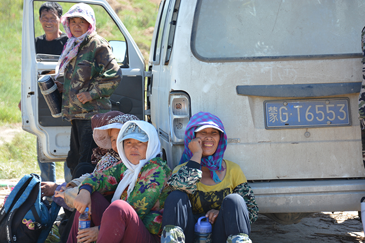 Pause à l’ombre pour des habitants engagés dans la restauration des terres dégradées dans la zone sableuse de Horqin, à Tongliao, région autonome de Mongolie intérieure.