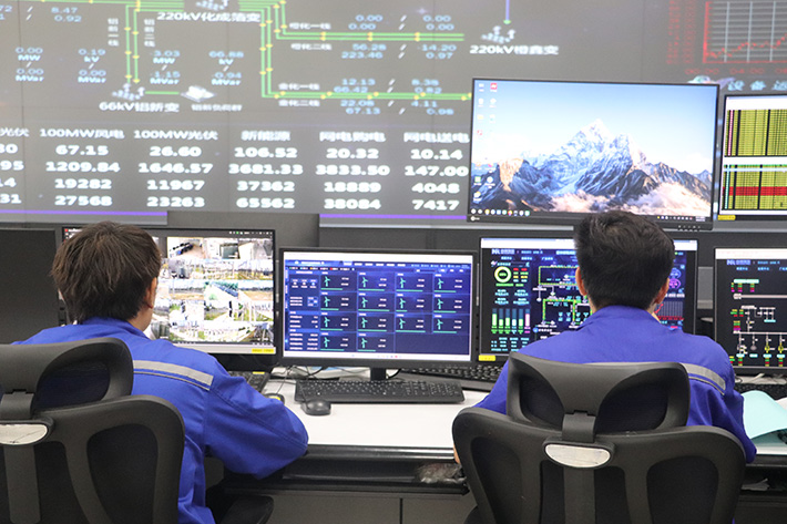 Des techniciens supervisent les opérations au centre de contrôle du réseau électrique de la zone de haute technologie de Holin Gol à Tongliao, région autonome de Mongolie intérieure, le 28 juillet.
