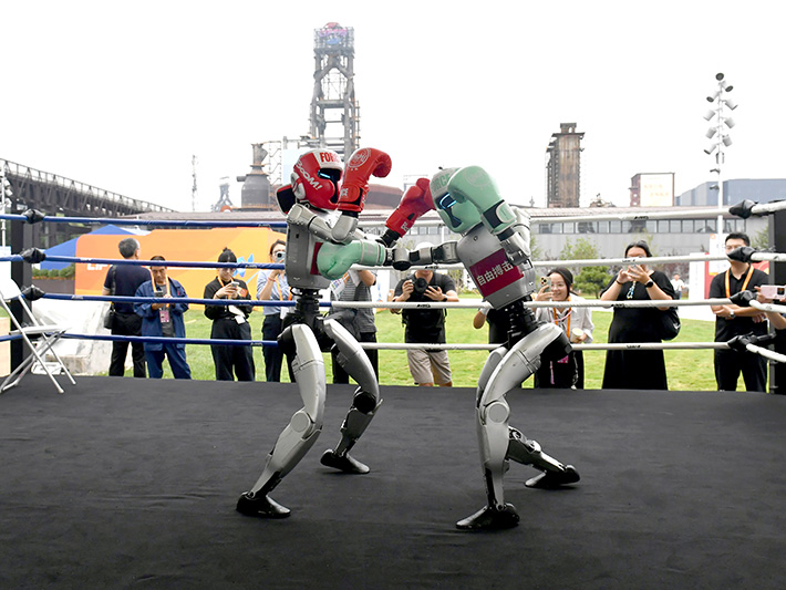 Deux robots s’affrontent dans un match de boxe libre lors de l’édition 2025 de la CIFTIS, à Beijing, le 10 septembre. (PHOTOS : DONG NING)