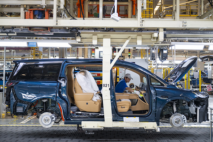 Un ouvrier installe des composants sur la chaîne de production de Voyah, marque publique de véhicules à énergies nouvelles, à Wuhan, province du Hubei, le 9 avril. (XINHUA)
