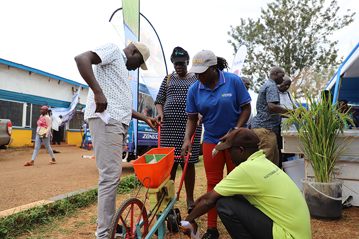 Des visiteurs découvrent un semoir chinois à deux roues poussé à la main lors d’une exposition agricole en Ouganda, le 8 août 2023. (XINHUA)