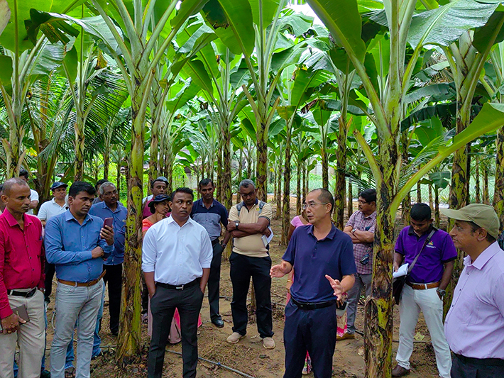 Un expert chinois dispense une formation technique à des agriculteurs locaux dans une base de démonstration de culture de bananes au Sri Lanka, le 10 octobre 2024. (XINHUA)